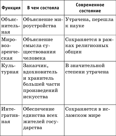 Исторически роль религии в жизни общества была чрезвычайно высока. Религия выполняла множество функций: объяснительную, мировоззренческую, культурную, интегративную, компенсаторную, легитимизирующую, коммуникативную.
