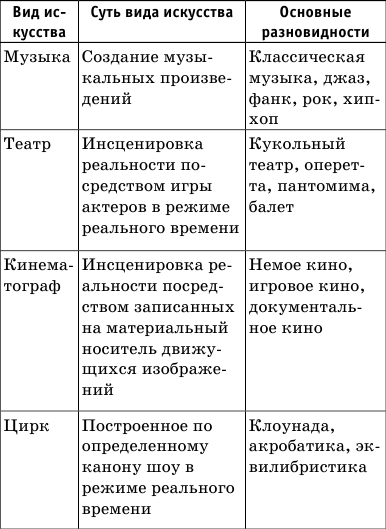 Формирование чувства прекрасного – одна из важнейших функций искусства (эстетическая). Другие его значимые функции: познавательная (получение нового знания о мире через художественные образы), воспитательная (формирование личности), гедонистическая (доставление радости и душевного комфорта), компенсаторная (восполнение недовольства реальной жизнью). Искусство реализуется в отдельных художественных произведениях, которые различаются по видовым, жанровым и стилистическим характеристикам. Основные виды искусства: архитектура, живопись, скульптура, декоративно-прикладное искусство, литература, музыка, театр, кинематограф, цирк, фотоискусство, эстрада.
