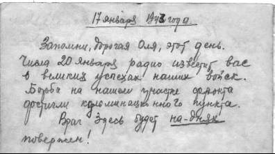 «Запомни, дорогая Оля, этот день. Числа 20 января радио известит вас о великих успехах наших войск. Борьба на нашем участке фронта достигла кульминационного пункта.
