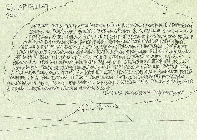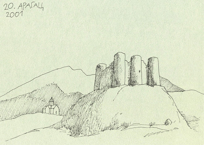Переночевали мы у Сусанны Гюламирян, а с утра художник Артак Погосян вызвался повозить нас по окрестностям Еревана. Мы залезли в разбитые «Жигули» и сначала поехали в Хор Вирап, полюбовались монастырем, который я очень люблю, посмотрели на Арарат, дрожавший в жарком мареве, и на турецкую границу. Заглянули в Арташат, вернее, в деревеньку на его окраине.