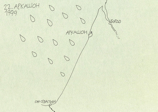 Мы отправились в Аркашон из Бордо, это недалеко, около шестидесяти километров. В Бордо было солнечно; когда приехали к океану, моросил дождь, по небу неслись низкие серо-синие облака. На волнорезе девочка в ярко-желтой пластиковой накидке, борясь с прихотями ветра, запускала желтого воздушного змея – он все время норовил упасть в море.