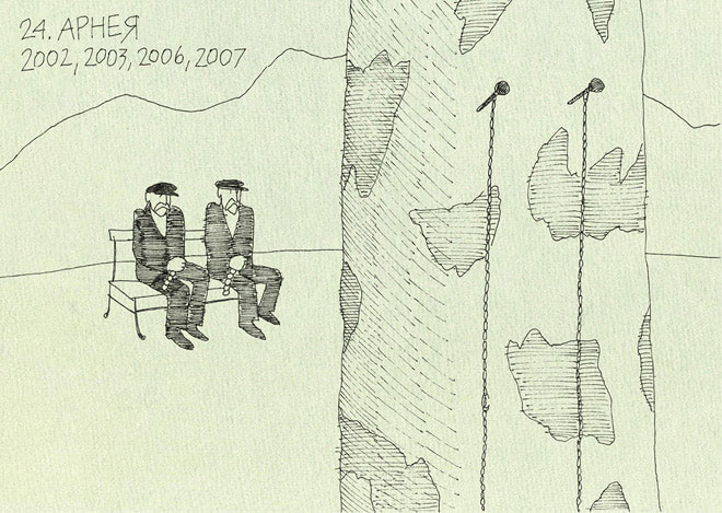 Арнея лежит в долине между зеленых даже в августовскую жару, прохладных, хотя и невысоких гор. Их склоны заставлены разноцветными ульями, и это дает любопытный оптический и ментальный эффект: вблизи понятно, что смотришь на фанерные коробки, выкрашенные в голубой, белый, зеленый, желтый, красный, лиловый, оранжевый цвет; вдали они обманчиво глядятся цветочками – и какого же размера должны быть пчелы, сосущие их нектар?