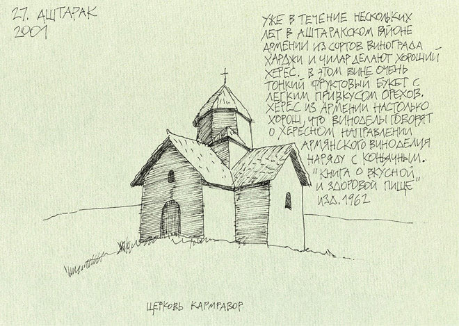 В Аштараке я подумал, кроме прочего, о вине «Аштарак», похожем на херес. Недаром Микоян в «Книге о вкусной и здоровой пище» рассуждал об «особенном хересном направлении армянского виноделия». Это вино я с удовольствием пил в юности, впоследствии распробовал настоящие хересы и амонтильядо из Андалусии. «Аштарак» рядом с ними – вполне достоин. Думаю, потому, что в Андалусии наверняка такое же безжалостное солнце, как в Армении; история этих двух стран, как ни парадоксально, имеет много общего, так что синтез горечи и сладости вполне естественен и для танцующих фламенко, и для играющих на дудуке.
