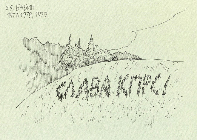 От церкви виднелась долина Рыбницы и противоположный склон с высаженной из маленьких елочек надписью: «Слава КПРС». С каждым годом деревца подрастали, буквы смазывались – и через два года уже почти не читались.