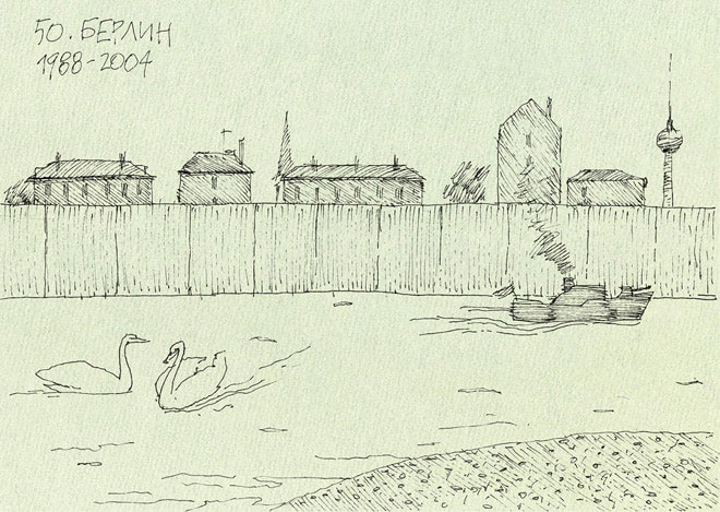 Мне очень полюбилось одно место на берегу Шпрее – туда можно было пробраться через дыру в изгороди из колючей проволоки. Горы песка, лопухи, кусты акации (как у Генриха Сапгира: «У черты цивилизации расцвели кусты акации…»). Я брал с собой бутылку вина, смотрел на воду, на лебедей, плававших вдоль берега, на гэдээровский сторожевой катер, курсировавший туда-обратно по фарватеру, и на другой берег, фланкированный пятиметровыми бетонными плитами с колючей проволокой поверху. Потом Лиза мне сказала, что по мудреной берлинской политгеографии место моего отдохновения принадлежит ГДР и находиться там небезопасно.