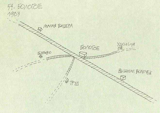 Естественно, я много раз проезжал Бологое на пути в Питер и обратно. Однажды очутился там часа на три глухой ночью. Мы с Колей Панитковым ехали в деревню недалеко от Осташкова, где у его друзей был дом. В Бологом часть вагонов отцепили от поезда и отогнали на дальние пути. Мы спросили у проводницы, долго ли будем стоять; она ответила, что не меньше трех часов. Спать не хотелось, и мы пошли к вокзалу. Там было пусто, дремал кто-то на лавках. Постучались в дверь буфета, никто не откликнулся. Вышли на привокзальную площадь, там тоже ни души, куда-то тянулась скудно освещенная улица. Пошли обратно в вагон и легли спать. Сквозь сон я слышал, как застучали колеса, – поезд поехал дальше.