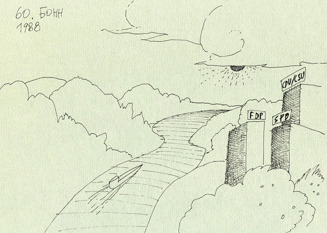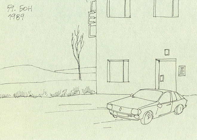Я туда приехал из Кёльна, где гостил у Бориса и Наташи Гройс, на трамвае. В Бонн меня пригласили граф и графиня Ламбсдорф, устроившие в соседнем Кёнигсвинтере выставку, где показывали работы Бориса Биргера и мои. Затея страннейшая – не вижу ничего общего между собой и Биргером.