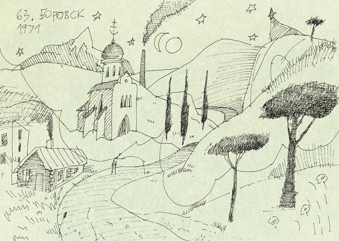 Итак, после Балабанова, в трясучем автобусе – в Боровск. Мне чудится, что на подъезде к Боровску дорога шла круто вниз, а потом в чаше, между холмов, открывался город, – прямо как в Италии? Конечно, чудится. Холмы вокруг Боровска низенькие, хотя и повыше, чем в большинстве мест Среднерусской возвышенности. Ее географы зачем-то лет двадцать назад разжаловали до звания Среднерусской долины.