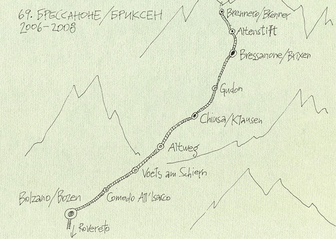 От Роверето до Больцано меньше часа на поезде по долине реки Адидже. Она вся засажена виноградниками и яблочными садами – когда едешь летом, воздух пропитан сладостным яблочным духом. Но и поздней осенью, когда я решил посетить Брессаноне (Бриксен), чудилось, что запах не выветрился. За Меццакороной кончается область Трентино, начинается Южный Тироль. Если Трентино еще более или менее Италия, то тут многое меняется. Другие очертания гор, архитектура уже совершенно австрийская, а все названия на двух языках: Ора – Ауэр, Энья – Ноймаркт, Вадена – Платен.