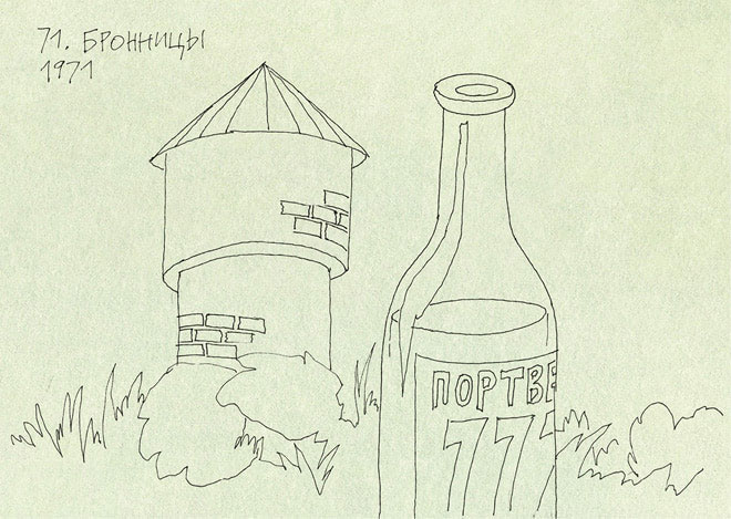 Я учился на третьем курсе МХУ, мы ездили на дачу к кому-то из соучеников в Пески, в поселок художников, а на обратном пути зачем-то высадились в Бронницах, купили в привокзальном магазине портвейн и пили его на заросшем лопухами пустыре, в тени водокачки.