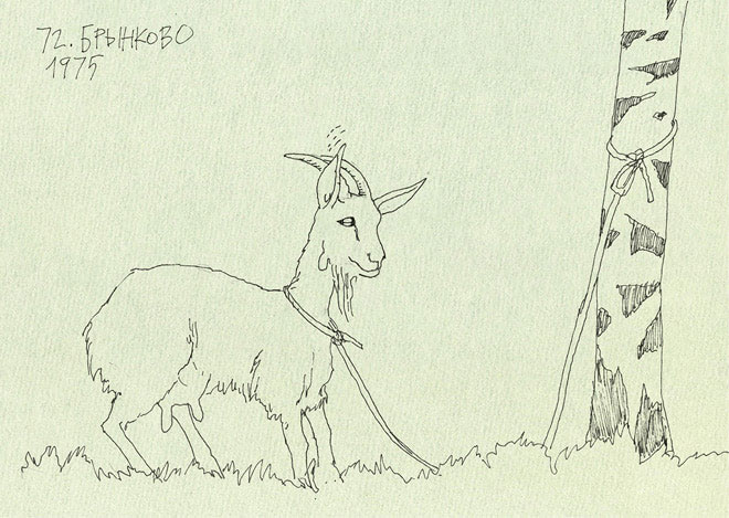 Был серенький денек. На яркой зеленой траве, совсем не осенней, вдоль берега Рузы паслись привязанные к белым березам белые козы, они взглядывали на нас янтарными глазами, перечеркнутыми черными горизонтальными зрачками. За березами белела церковь с голубенькими главками. Ничем не примечательная, но я ее вспоминаю не реже, чем истинные шедевры русской архитектуры вроде Покрова на Нерли. Ее стандартность и эстетическая беспомощность – такие церкви повсюду в Подмосковье – делает ее обязательной и благословляющей приметой среднерусского пейзажа.