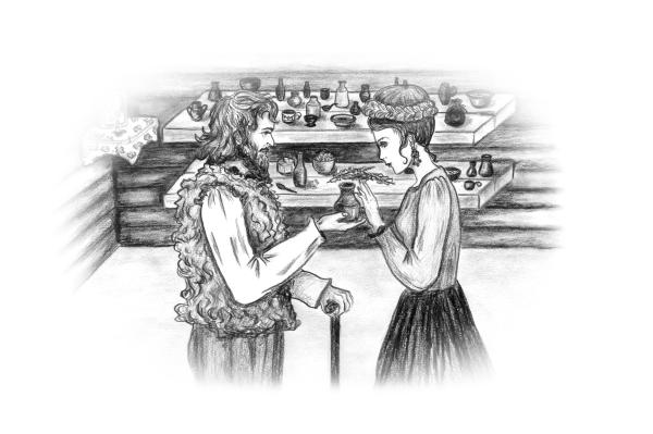 В лесном краюДавным-давно в краю лесномЖили муж с женой вдвоём.Хватало пищи и вещей,Только Бог не дал детей.Не могли никак дитя родить,А без детей нет смысла жить.Долго думала жена,И решила так она:«Схожу за старый бурелом,Где шалаш, а может, дом.Живёт там странный мужичок,То ли мудрец, то ль звездочёт,Возможно, добрый, может, злой,Но это шанс последний мой.Говорят, коль пожелает,Хорошим людям помогает».Она накинула платочек,Взяла со снедью узелочек,Разместив его в корзинке,По лесной пошла тропинке.И так спокойно, не спеша,Дошла до дома-шалаша.В дверь постучала кулачком,Только тихо в доме том.«Что же делать мне теперь?»Приоткрыла тихо дверь,Видит горницу большую,Удивительную, не простую.Посреди очаг остывший,Пучки трав над ним повыше.Стол за ним стоит резной,Покрыт скатертью льняной.На столе цветов букет,Из окошка льётся свет.Справа у стены столы,Будто низкие шкафы,На стене над ними полочки,На них баночки и плошечки.А на столах сосудыДиковинной посуды:Тёмные, прозрачные,Изящные, невзрачные,Низкие, большие,Полные, пустые.В каких-то склянках чуть шипело,В каких-то аж ключом кипело.Раствор сочился из одних,Дымок вился из других.В углу икона «Божья мать».Слева скамья или кровать,Мех медвежий на скамьеИ такой же на стене,Медвежья шкура под скамьёй…– Кто нарушил мой покой?Проходи сюда смелее,Может, чем помочь сумею.Расскажи мне, кто ты есть,Что найти желаешь здесь?Может быть, мы и поладим, —Раздается голос сзади.А она ему в ответ:– Здравствуй, дорогой сосед.В лесу этом и мой дом,С лесником живём мы в нём.Навестить пришла я вас,Захватила свой припас.Развязала узелочек,Разложила на платочекПирожки румяные,Тёплые и пряные.– Вот с грибами, вот с брусникой,Эти с ягодой черникой.Я прошу, отведай, брат.– Что ж, соседка, очень рад.Пирожки ну просто диво!За что огромное спасибо.Но пришла ты не за этим.Я много повидал на свете.Перейдём к твоей беде.Я помогу, сестра, тебе.Подожди немного только.Повернулся молча к полкам.Наливал там в склянки что-то,Подливал, шептал о чём-то,Перелил смесь в пузырёкИ тогда только изрёк:– Я тебе с собою дамВ пузырьке этом бальзам,Перед сном его попьёшьИ с этой ночи понесёшь.