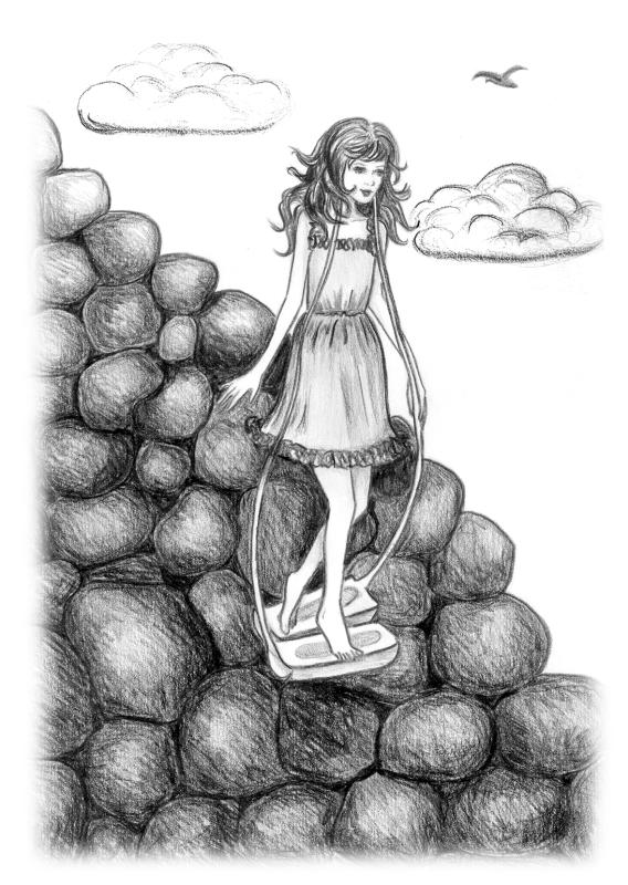 Расти и крепнуть принялисьИ со скалы спустились вниз.На свои уши Дарья встала,На них и опускаться стала.Когда ж на землю встали ножки,Помчалась Даша по дорожкеНе медля ни минуты, без оглядки,Лишь только засверкали пятки!Ушки были уж на месте.Где дом, ей было неизвестно,Но об одном лишь думала девица,Как скорей от Вихря скрыться.