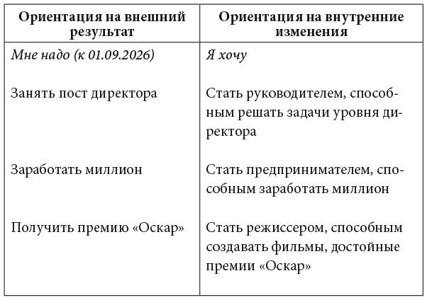 Постановка целей в терминах внешних результатов для меня звучит как «Мне надо ИМЕТЬ что-то», а в терминах внутренних изменений – как «Я хочу БЫТЬ кем-то». Если я способна решать задачи уровня директора, значит, я могу выполнять роль директора не только в этой компании и не только в данной сфере, но и во многих других. Если я способна заработать миллион, то могу заработать еще один, а потом еще один и так далее. Если я способна создать достойный «Оскара» фильм, то я могу создать еще много таких фильмов.