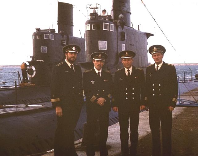 Командование С-53 (справа) и С-101 перед передачей лодок сирийским ВМС. Слева направо: старший помощник С-101 капитан 3 ранга Василий Личинкин, командир С-101 капитан 2 ранга Валерий Матвеев, командир С-53 капитан 3 ранга Владимир Аникин, старший помощник С-53 капитан 3 ранга Сергей Болдырев