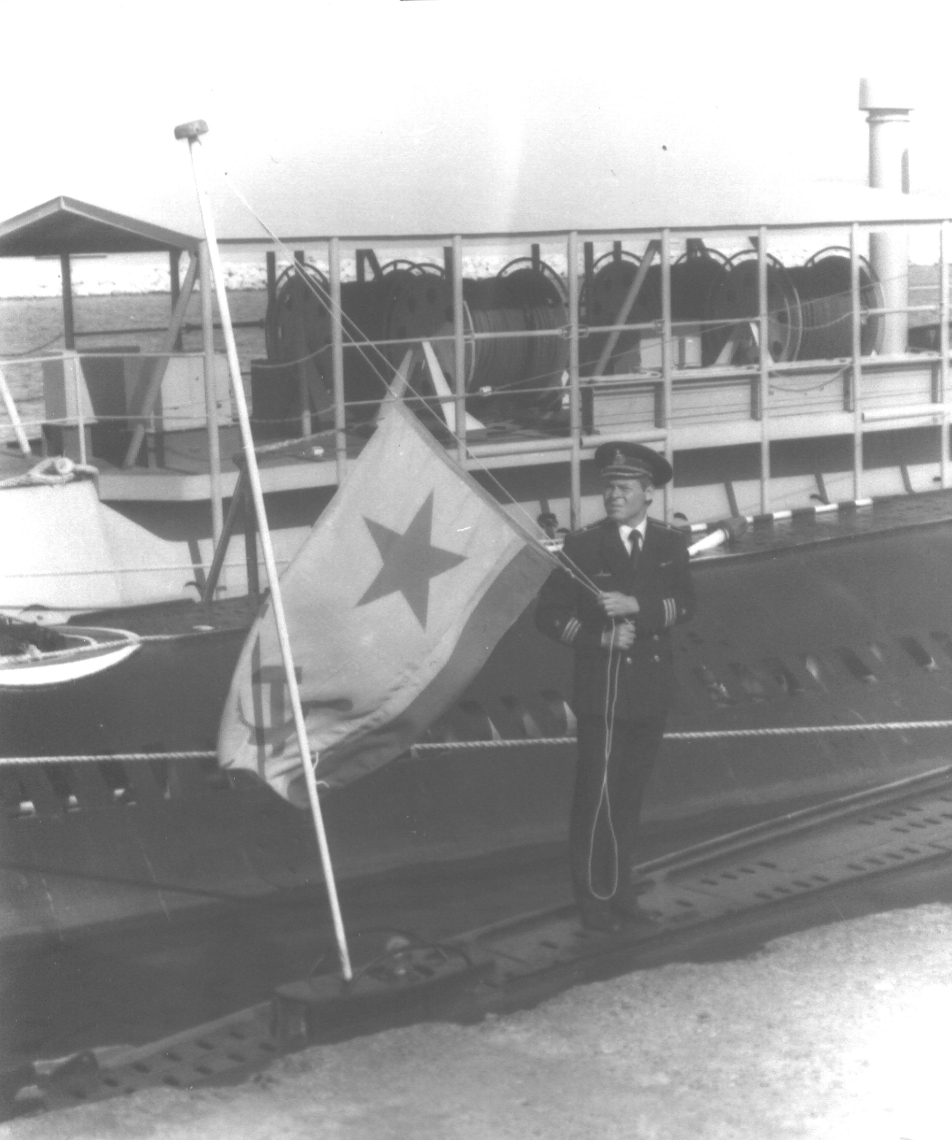 Командир С-53 капитан 3 ранга Владимир Аникин спускает Военно-морской флаг