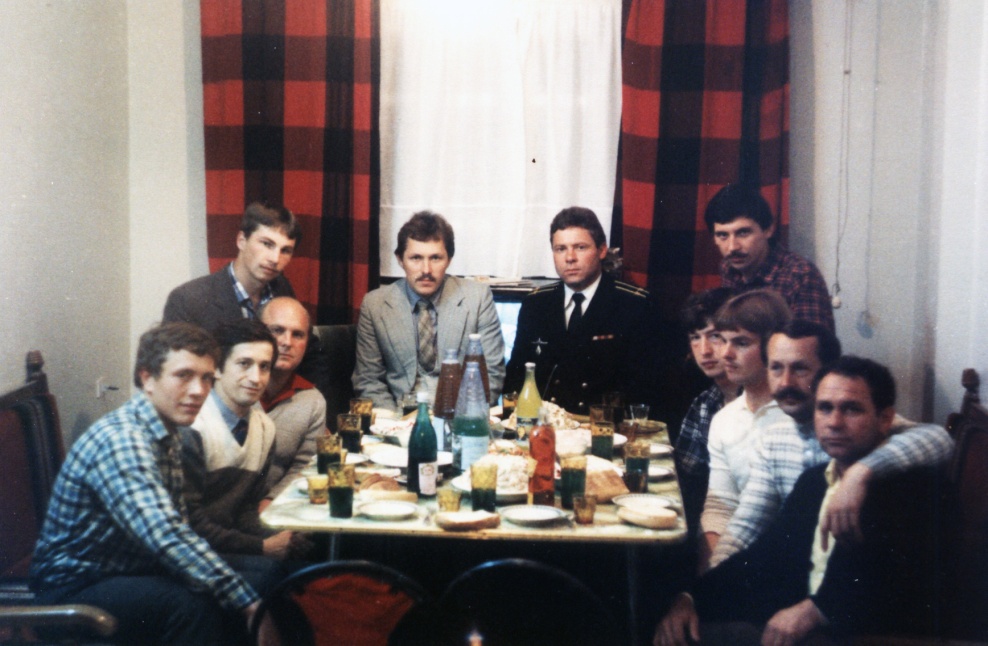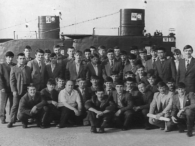 За праздничным столом по поводу присвоения командиру С-53 очередного воинского звания – капитан 2 ранга. Слева направо: старшина 1 статьи Юрий Волобуев, старший лейтенант м/сМихаил Шариков, капитан-лейтенант Владимир Бурков, старшина 1 статьи Василий Лобов, командир С-101 капитан. 2 ранга Валерий Матвеев, командир С-53 капитан 2 ранга Владимир Аникин, мичманы: Григорий Кашырин, Юрий Максименко, Александр Бандурко, Вячеслав Довгань, Николай Басанец