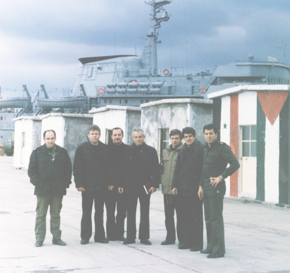 Совместное фото с командованием и офицерами штаба сирийской бригады ПЛ. Слева направо: второй капитан 2 ранга Владимир Аникин, четвертый капитан 2 ранга Виктор Вахренев, пятый капитан 3 ранга Владимир Коржавин