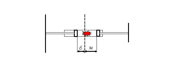 Предлагаемый принцип механизма явления инерции и перераспределения сил и соответственно энергии взаимодействия с учётом среды нетрудно смоделировать и проверить на опыте в лабораторных условиях (см. Рис. 1.2.2). Вертикальные линии на концах обоих поршней на рисунке – это паруса, слева большее тело (б), справа соответственно меньшее тело (м). Соотношение масс тел и соответственно их парусов мы сохранили, как и в предыдущем описании (2:1).
