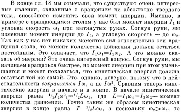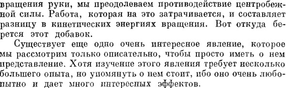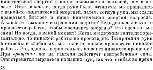 Фейнман правильно отмечает, что тело вращающегося человека при сгибании им рук с гантелями не изменяет свой момент инерции (приведённое сопротивление, см главу 3.4.), т.к. радиус самого тела остаётся при этом постоянным. Но если при сгибании рук тело человека начинает вращаться быстрее, значит, увеличивается его линейный импульс, т.е. «на тело должен действовать момент силы», как говорит сам Фейнман, или в нашей версии просто сила.