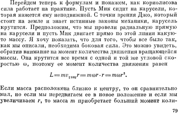 Фейнман правильно определил направление классической фиктивной, силы инерции Кориолиса. Вот только он почему-то не объяснил, как фиктивная сила инерции может реально толкать тело в бок, создавая реальный момент, увеличивающий скорость вращения гантелей и человека с реальным ускорением, против которого и направлена поддерживающая сила. Фейнман так же не объяснил, как же в таком случае называть ещё одну фиктивную силу инерции, которая проявляется в этом движении, как реакция со стороны тела человека на реальный момент со стороны гантелей.
