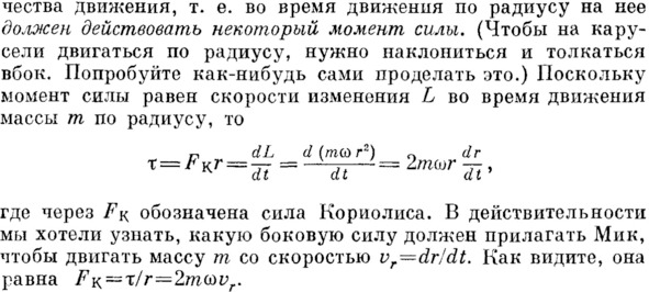 Это не может быть центробежная сила, т.к. она направлена по радиусу, говорит Фейнман. Следовательно, среди сил, возникающих во вращающейся системе центробежная сила не одинока: есть ещё и другая сила: «Эта другая сила носит название кориолисовой силы, или силы Кориолиса». Фейнман отмечает, что: «Она обладает очень странным свойством: оказывается, что если во вращающейся системе мы двигаем какой-то предмет, то она толкает его в бок». «…Именно эта „боковая сила“ и создаёт момент, который раскручивает наше тело».
