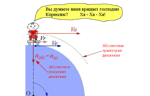 Остаётся только единая гравитационная связь человечка с центром вращения, которая обеспечивала абсолютное движение и на до космических скоростях и теперь. Физически в этой схеме абсолютного ничего не изменилось. Следовательно, в единой связи (единое связующее тело) не имеют физического смысла и ускорения всех придуманных классической физикой гипотетических Кориолисов, как нет их и в обычном равномерном вращательном движении без промежуточных звеньев.