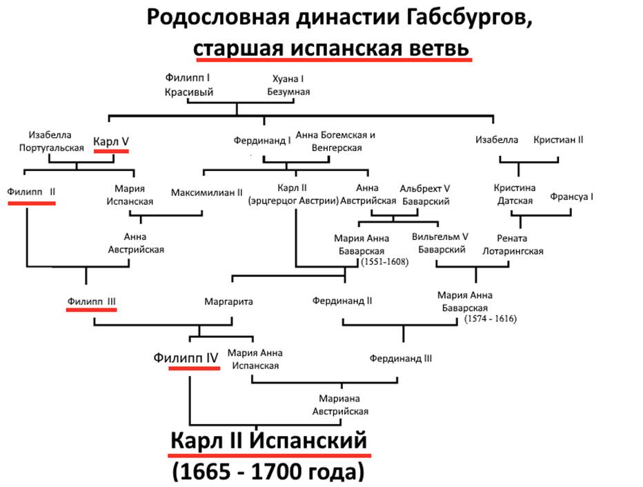 На представленной выше родословной красной линией выделены монархи, которые и являются старшей испанской ветвью Габсбургов. В то время как обычный человек в пятом поколении имеет 32 различных предка, у Карла II по причине близкородственных браков в роду их было только 10, и все 8 прадедов и прабабок произошли от Хуаны I Безумной.