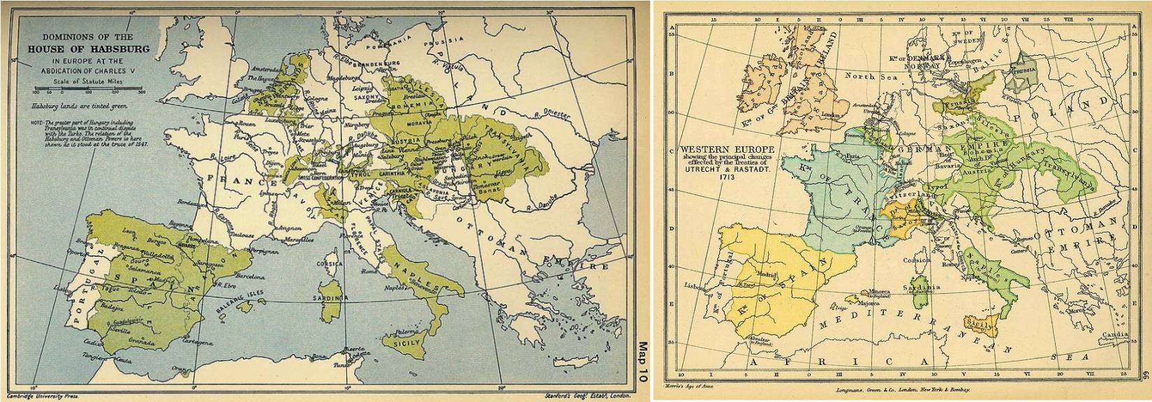 Рисунок 30 – Испанская империя в 1556 (владения зеленым) и в 1713 годах (владения желтым)