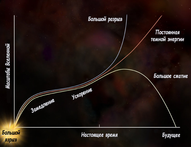 Есть несколько основных сценариев, по которым будет происходить дальнейшая эволюция Вселенной.