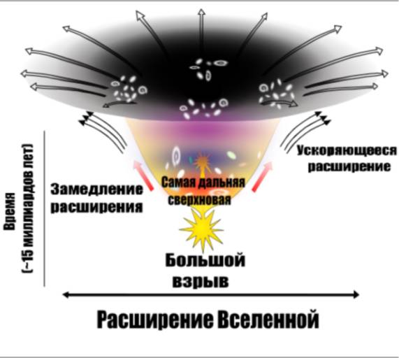 То есть хотя бы с точностью утверждения, что вся вселенная разлетается после «Большого взрыва». Поскольку этот разлёт оказался противным здравому смысл – звездные системы вселенной разлетаются не так, как положено по законам взрывотехники – полетел и остановился со временем, а со всё возрастающем ускорением!