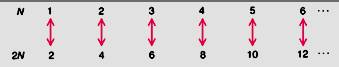 Действительно, согласно рисунку, числовой парный ряд уходит в бесконечность. И целые числа его можно одно за другим объединить в пары с чётными числами, не исчерпав какого-либо из множеств этих чисел. В первой паре два числа рано четному – два, во второй – четыре цифры (1,2,3,4) дают четное число 4, в третьей 6=6 и т.д.