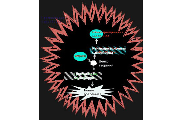 Нас интересует факт начала творения. Он двоичен в своей первооснове. Всё зависит от того, испытывал ли наш волчок внешнее воздействие или нет. В варианте рекарнационного сотворения первотолчок для начала процесса производит «Матрица» космической памяти, когда-то погибшей или существующей вселенной. В результате по законам космической самосборки формируется физическая вселенная конечных размеров и временной продолжительности существования, которую можно охарактеризовать, как эволюционно – рекарнационную.