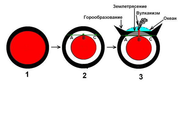 Она точно описывает то, что произошло с легендарным (а скорее всего таки существовавшим) материком на самом нашем северном полюсе! Центральный сплошной круг это сокращающейся объем расплавленного ядра Земли, а черный – твердая оболочка её коры, которая пассивно сопротивляется сжатию. В результате под оболочкой появляются пустоты. На самом деле пустоты не идеального повсеместного объёма, как на рисунке, а локальные. И вот однажды в каком-либо участке «АВС» нашего рисунка проседает до мантии и под грохот вулканических катастроф просевшая котловина заполняется морем, а по краям впадины иногда вырастают горные хребты.