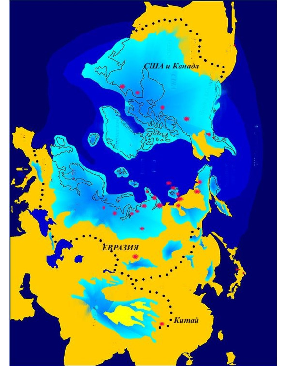 Если посмотреть на современную карту оледенения северного полушария Земли, в варианте максимального наступления ледников (см. следующий рисунок 25), то она кажется почти такой же фантастикой. На ней звездочками показаны места массового скопления костных остатков (могильники ледниковой фауны). Правда далеко не все, поскольку большая часть их на континенте Евразии теперь лежит на дне океана.