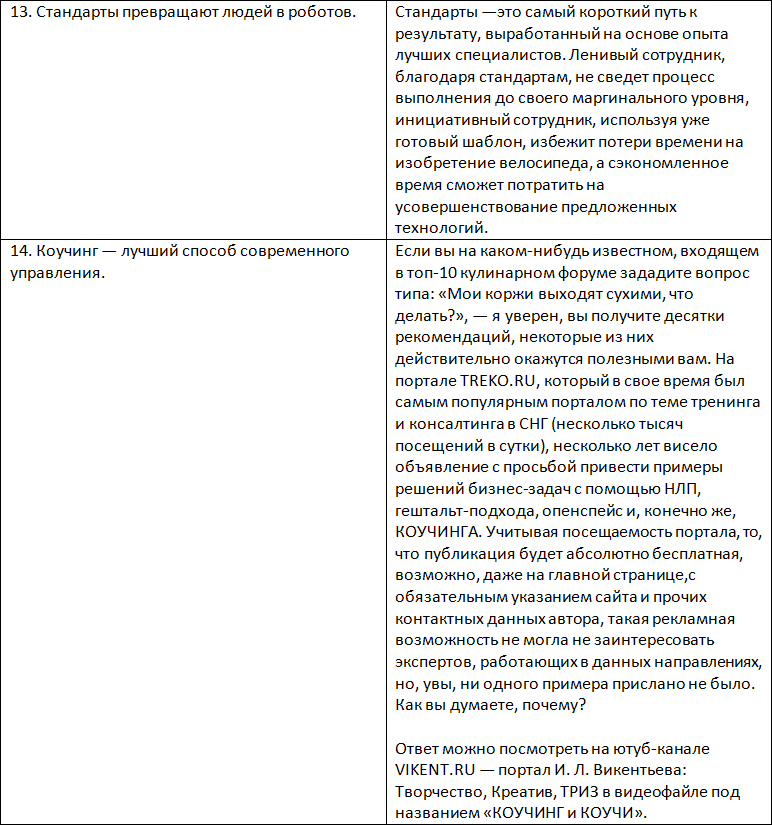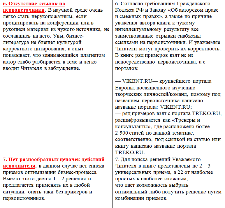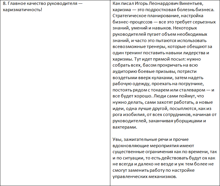 Далее постараюсь кратко ответить, чего в книге точно нет. Ниже в двух столбцах собраны ошибки, массово присутствующие в книгах по бизнесу, представленных на полках магазинов, и что предлагается в противовес популярным ошибкам.