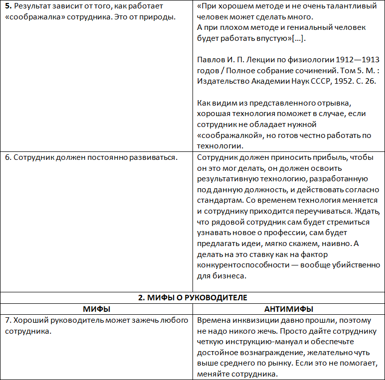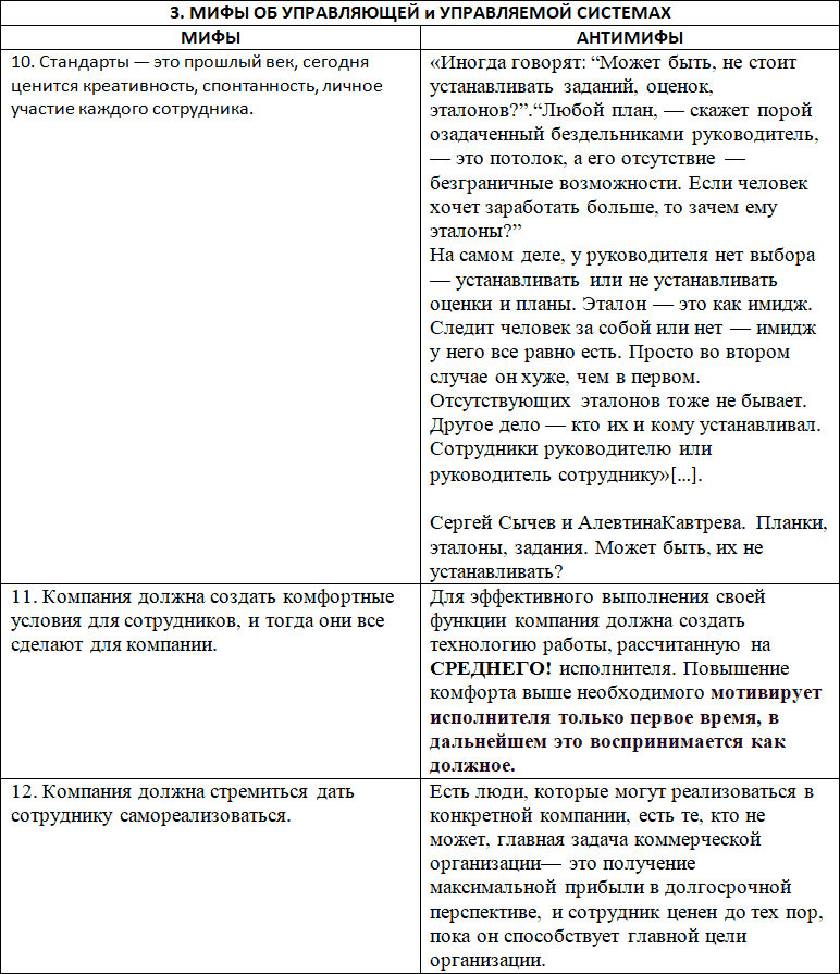 Для удобства мифы объединены в три группы: мифы о сотруднике, мифы о руководителе и мифы об управляющей и управляемых системах в целом.