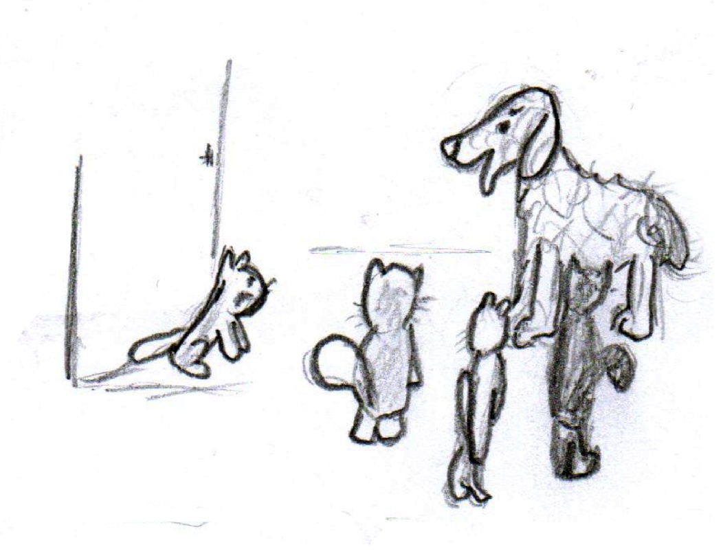 Из соседнего подъезда послышались сердитое рычание и жалобное мяуканье. Друзья ринулись туда. Кипа, Эмиль и Рыжий быстро оказались на третьем этаже, где крохотный котёнок вжался в дверь, а над ним, как грозовая туча, повисла голова лохматого пса.