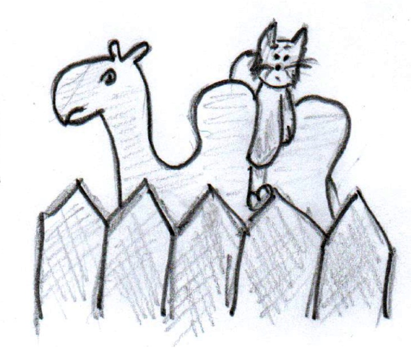 Кот и верблюд развернулись и пошли по тропинке, которая приведёт к дому с крышей похожую на пятую букву алфавита.