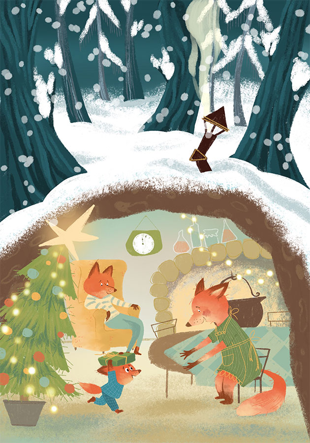 Степка с дедушкой спустились в гостиную и повесили часы над камином. Светка от нетерпения уже нарядила всю ёлку и не знала, чем заняться.