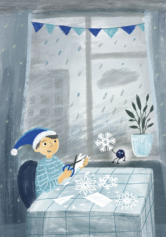 Это случилось зимой. Настоящей зимой, если верить календарю. Маленький мальчик Кирюша смотрел в окно и грустил. А как тут не грустить, если на дворе уже давно декабрь, а снега все нет и нет. Детская площадка, качели, горка – все блестело от мелкого моросящего дождя, а так хотелось увидеть настоящий снег! И куда же он подевался? Кирюша вздохнул и вернулся за свой столик, где вырезал снежинки из бумаги. Раз снега нет на улице, то можно хотя бы сделать его дома и повесить на окно: вдруг получится приманить настоящую зиму! Кирюша очень надеялся на это.