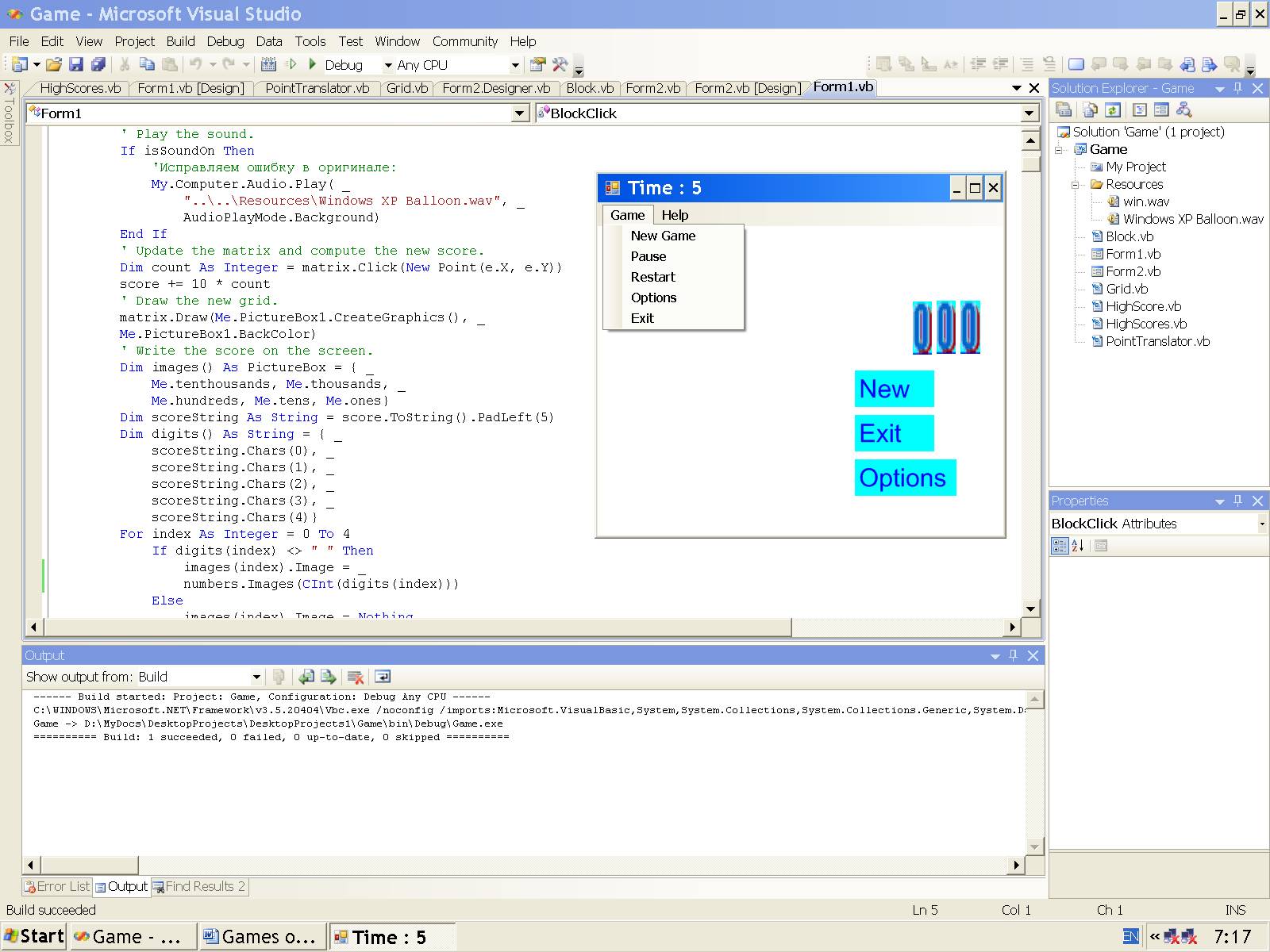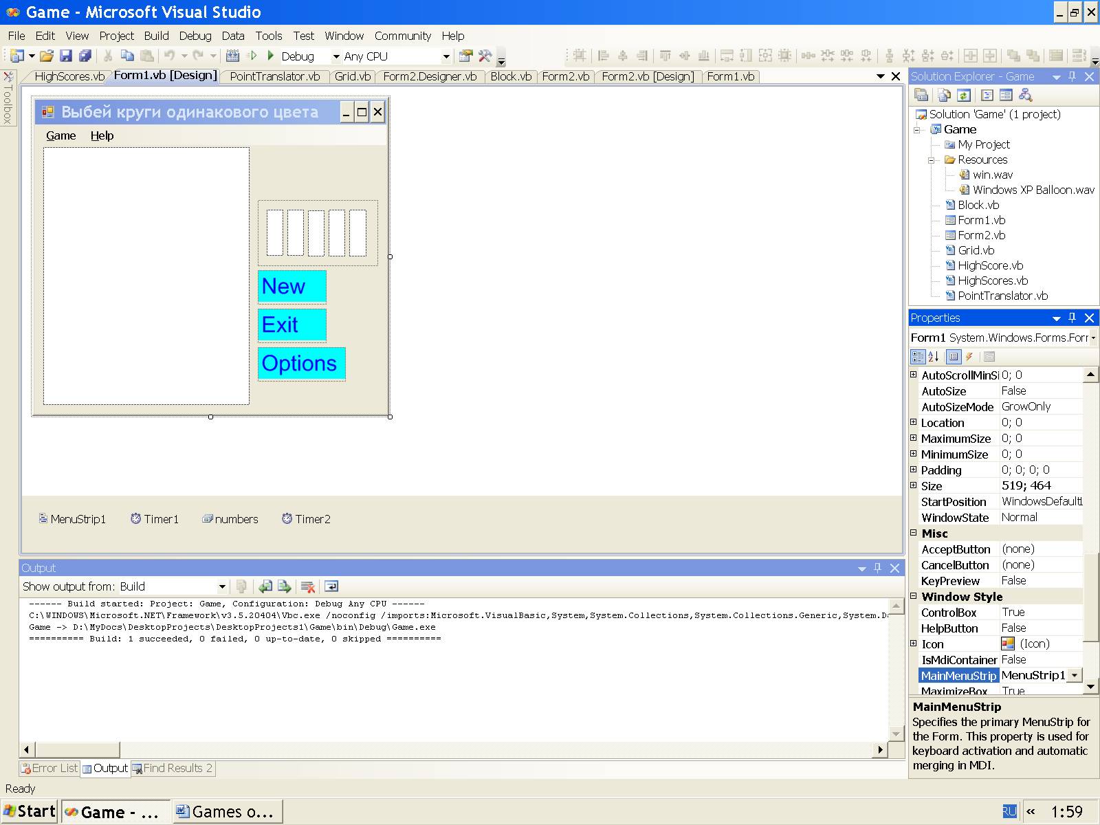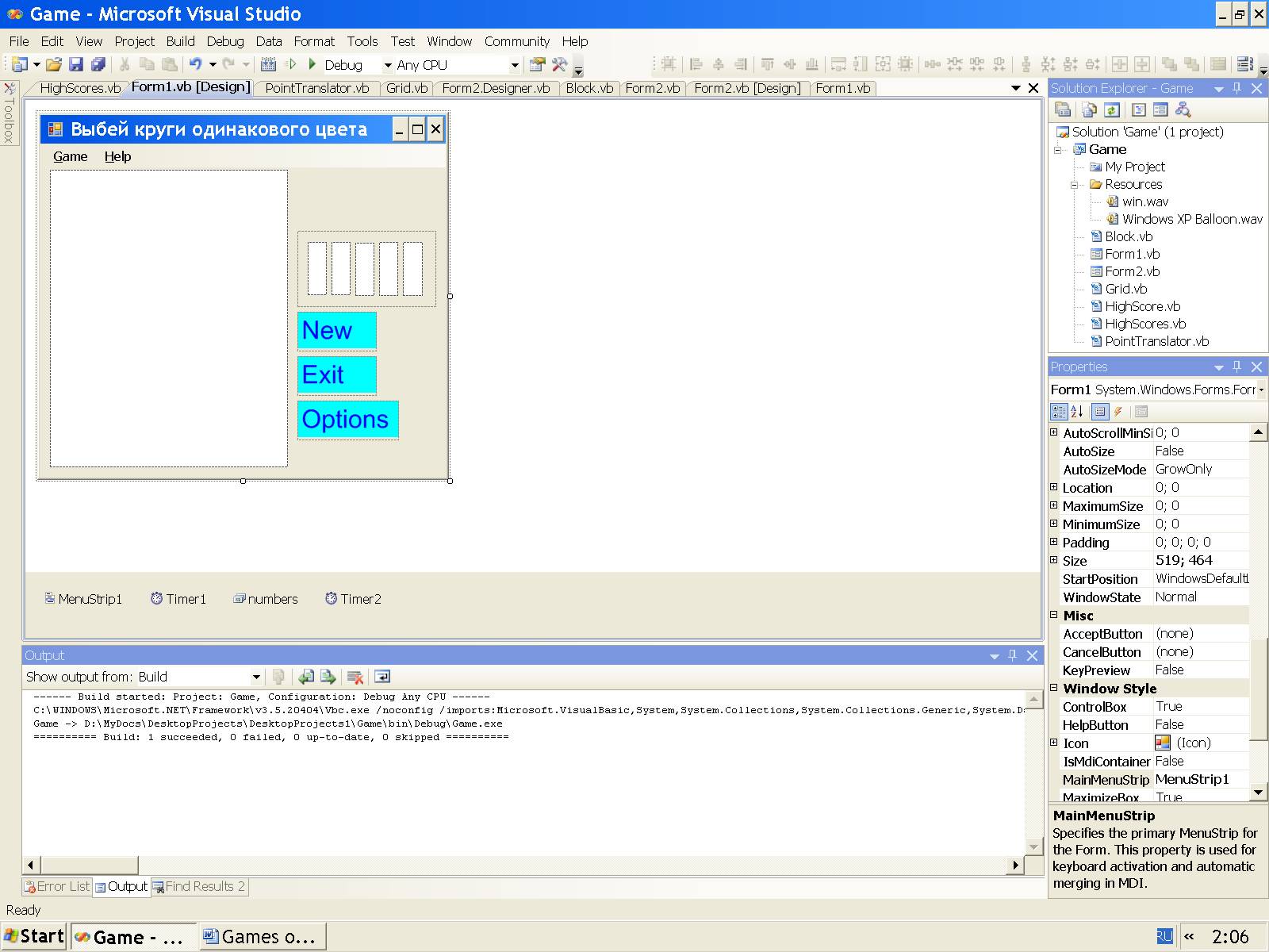 Данную игру мы будем разрабатывать, следуя игре Game с сайта microsoft.com. Авторы игры разработали её на устаревшей версии Visual Studio. Поэтому автор данной книги разработал эту игру на современной версии Visual Studio, исправил ошибки и дополнил её недостающими для типичной игры элементами, например, счётчиком секунд на форме и мелодией по окончании времени игры.