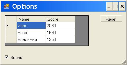 6. Имя игрока с выбитыми им очками заносятся в таблицу результатов Options (ее мы будем проектировать вместе с основной формой), которую можно увидеть, если на форме выбрать или элемент управления PictureBox с рисунком в виде надписи Options или в меню Game – команду Options. В таблицу Options искусственный интеллект заносит три лучших результата (рис. 20.6), причём на первом месте всегда будет игрок с наибольшим количеством выбитых очков (high score) независимо от количества попыток.