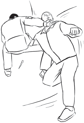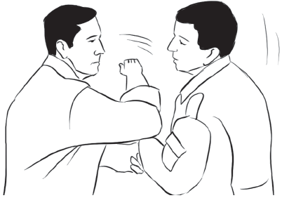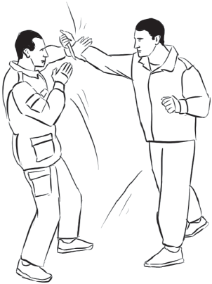 В таком случае руководитель распределяет группы обучающихся так, чтобы первые номера пар держали прямую руку, обозначая прямой удар рукой. Вторые номера с шагом левой ногой вперед встретили этот удар противника ладонью руки в плоскости нанесения с его внешней стороны, обозначив счет «раз». Затем подшагом правой ногой, немного сгибаясь в коленных суставах, одновременно провернули ладонь руки на 90 градусов, обозначив счет «два». После чего обозначили контратакующие действия на счет «три».