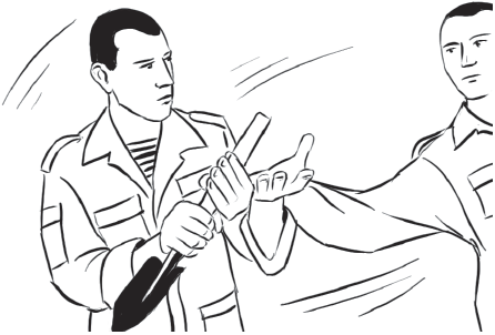 а) назвать прием, например: «Защита ножом от ударов ствольной частью автомата, лотком малой лопаты, ножом сверху»;