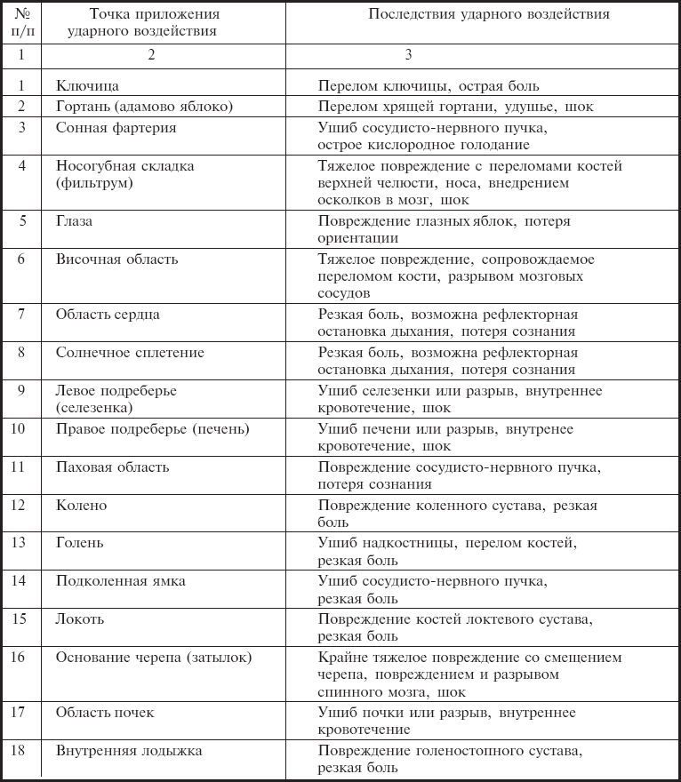 Знание уязвимых мест и степени возможного повреждения после выполнения тех или иных приемов позволит обучаемым осознанно подходить к изучению и практическому применению приемов в боевой обстановке (табл. 2).