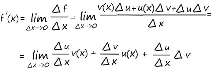 ∆f = f(x+∆x) – f(x) = u(x+∆x) * v(x+∆x) – u(x) * v(x) = (u(x) + ∆u) * (v(x) + ∆v) – u(x) * v(x) = u(x)v(x) + v(x)∆u + u(x)∆v + ∆u∆v – u(x)v(x) = v(x)∆u + u(x)∆v + ∆u∆v