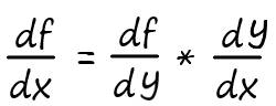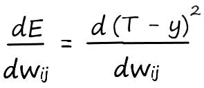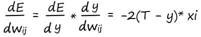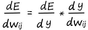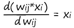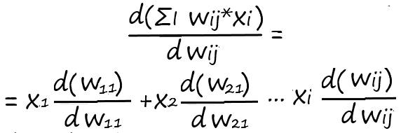 Так как выход нейрона – f(x) = y, а взвешенная сумма – у = ∑I wij*xi, где xi – известная величина (константа), а весовые коэффициенты wij – переменная, производная по которой, дает как мы знаем единицу, то взвешенную сумму можно разбить на сумму простых множителей: