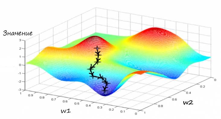 При нахождении производной функции ошибки (угол наклона спуска в точке), по каждому из весовых коэффициентов, находим новую точку функции ошибки, которая обязательно стремиться двигаться в направлении её уменьшения. Тем самым, находим вектор направления.