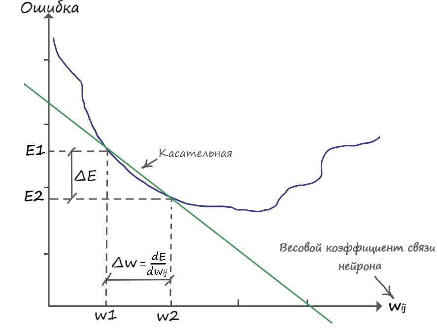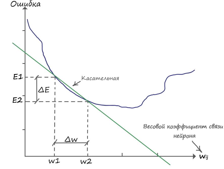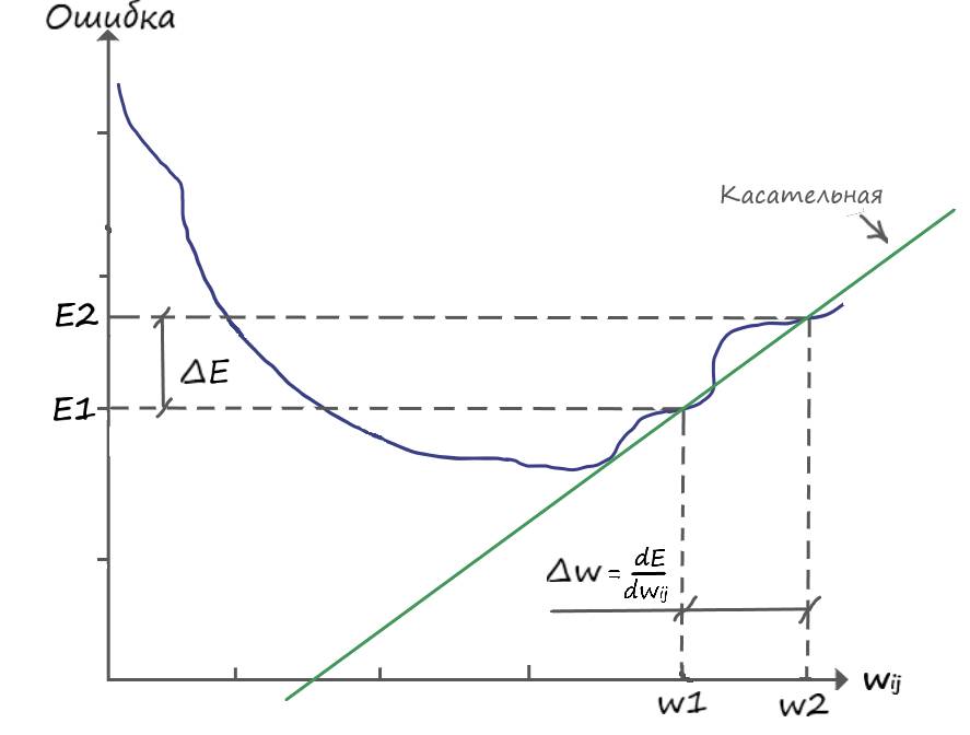 Ij – определитель веса, в соответствии со своим входом. Если это вход x1 – то его весовой коэффициент обозначается как – w11, а у входа х2 – обозначается как -w21. Чем круче наклон касательной, тем больше скорость изменения ошибки, тем больше шаг.